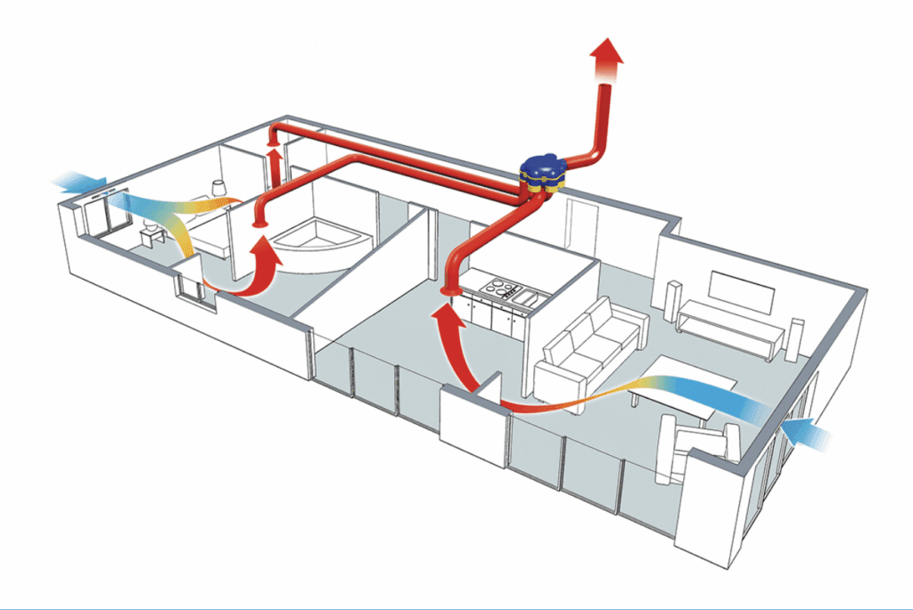 En parallèle, elle extrait l’air vicié des pièces humides comme la salle de bain, la cuisine ou les WC — comme une VMC classique.